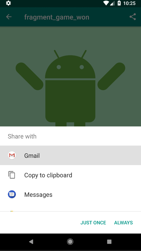 - 공유 기능은 GameWonFragment 클래스의 options menu를 통해 access할 수 있음